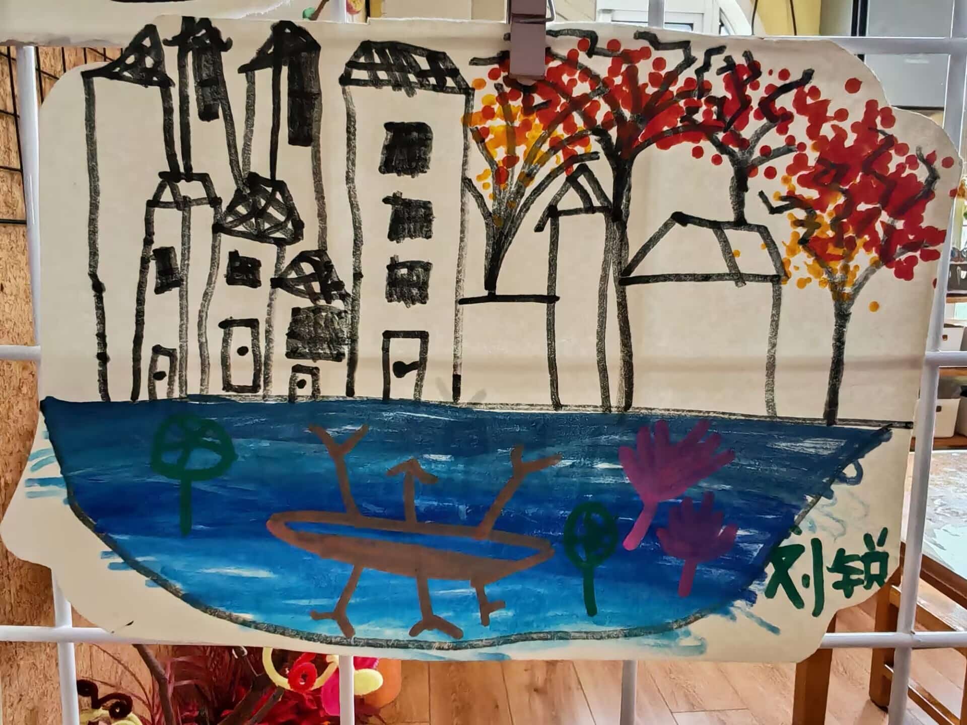 红橙相间的树叶在枝头跳着丰收的舞,错落的房屋藏着秋日的宁静,蓝色的“小池塘”里还游着特别的“小动物”……每一笔都是孩子眼中秋天的模样,每一处色彩都是他们和秋天的独家密语。
