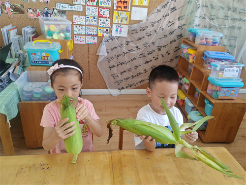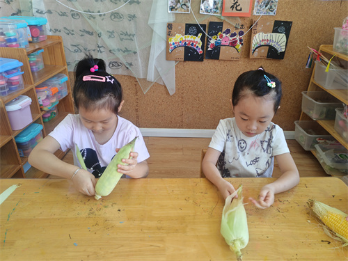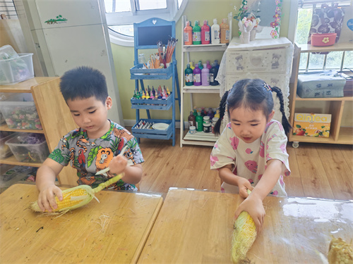 孩子们小心翼翼地撕开玉米的外衣,仿佛在打开大自然的礼物。当最后一层外衣落下,整整齐齐的玉米排着队,像一排排整齐的牙齿,孩子们看到了这么多金黄色的玉米好开心啊!