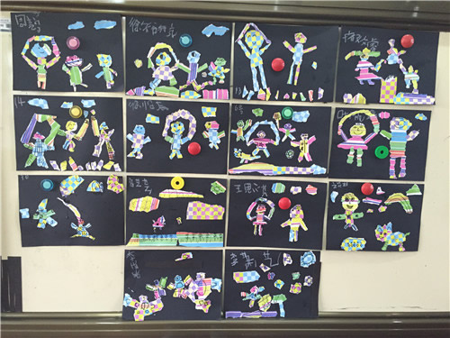 撕纸画是一种适合少儿特点,富于游戏性的艺术活动,它集知识性与趣味性于一体,对于开发儿童智力、培养发散性思维和创新能力有着独特的优势。艺术领域中要支持幼儿富有个性和创造性的表达,对幼儿创造性的能力培养,也可以在撕纸活动的过程中加以培养。近阶段我们开展了“运动吧”主题撕纸活动,让幼儿运用彩纸进行撕贴、添画,大胆地表现。孩子们选择条纹或格子图案的彩纸开始画、撕、贴、添画,每一副画都是充满灵性的心声:有的小人在跳绳,绳子高高地甩在空中;有的小人在拍球,边拍边数着个数;有的小人在打羽毛球,两人合作开心玩耍;有的小人在投篮,看准篮筐进球啦……我们把撕纸和绘画活动作为一个载体,让幼儿能快乐的“玩”,在这个过程中重新唤醒孩子本来的童真。