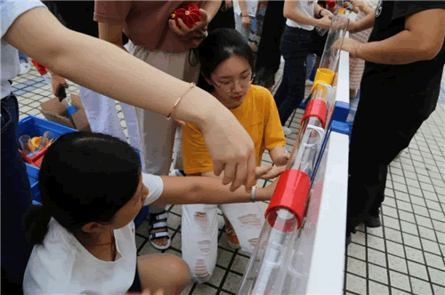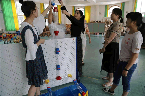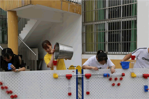 随后,老师们分为三组,以“音乐喷泉”“水车转转转”为主题开展了沙水区活动材料体验游戏。通过热烈探讨、相互配合,老师们运用多种材料在多孔板上安装管道,不断尝试、大胆操作,成功地开展了“音乐喷泉”“水车转转转”游戏,感受到沙水游戏带来的乐趣。