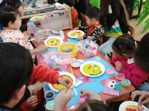 大大的圆圆的披萨饼是孩子们喜欢的一种美食。当娃娃家的宝宝肚子饿了,孩子们总会拿模型披萨饼给娃娃吃。结合这一兴趣点,利用轻泥、彩纸和纸盘,为幼儿创造接触多种材料的机会,并能引起对色彩的关注。孩子们与爸爸妈妈一同畅想,一同制作……快来品尝一下小厨师们的手艺吧!