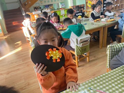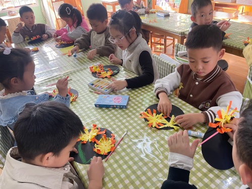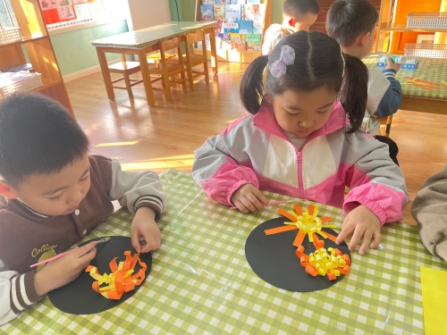 看!彩纸在我们手中变成了卷卷的菊花头发。秋风起,菊花开,我们把秋天留在作品里。献给爷爷奶奶,共赏最美重阳秋色。