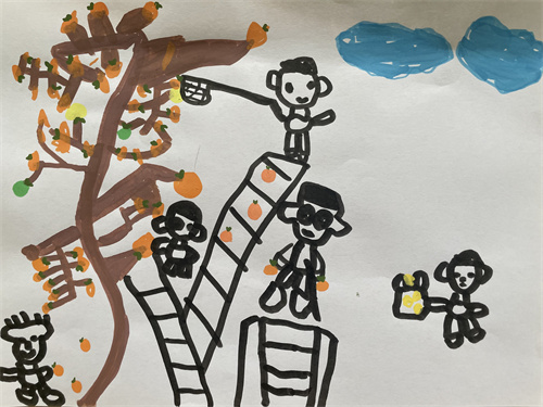 苏贞亦(5岁):就拿我们早晨户外活动时候玩的木梯,搭起来应该就能够到橘子了吧。